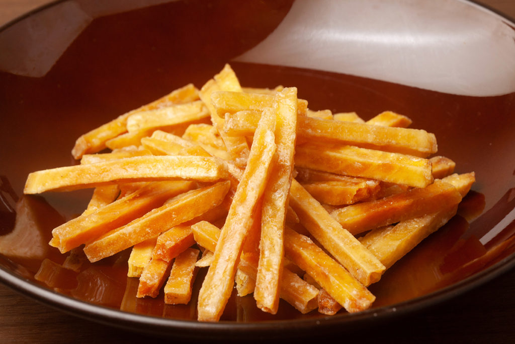 サツマイモを細長く切り、油でカリッと揚げて砂糖を絡めたお菓子。