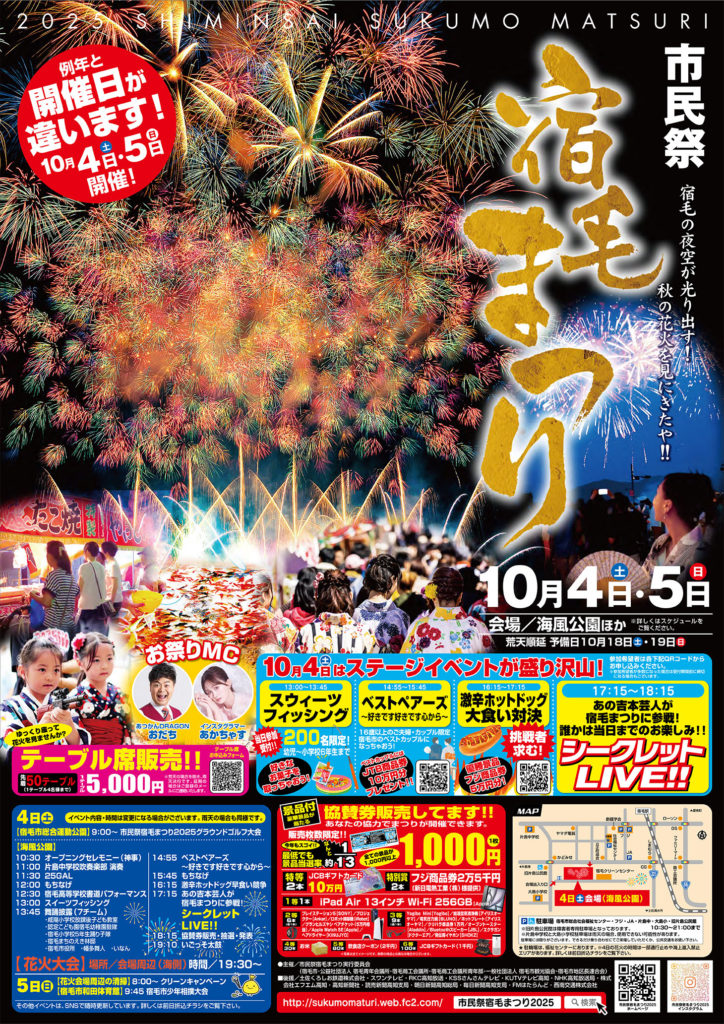 The Sukumo Festival will be held on October 4–5, 2025 in Sukumo City, Kochi. Highlights include stage events on the 4th and a spectacular fireworks display with about 5,000 fireworks on the 5th. With food stalls, local performances, and the stunning Sukumo Bay as the backdrop, it’s one of the best autumn festivals in Kochi. Easy access from Sukumo Station. Don’t miss the chance to enjoy an unforgettable evening in western Kochi!