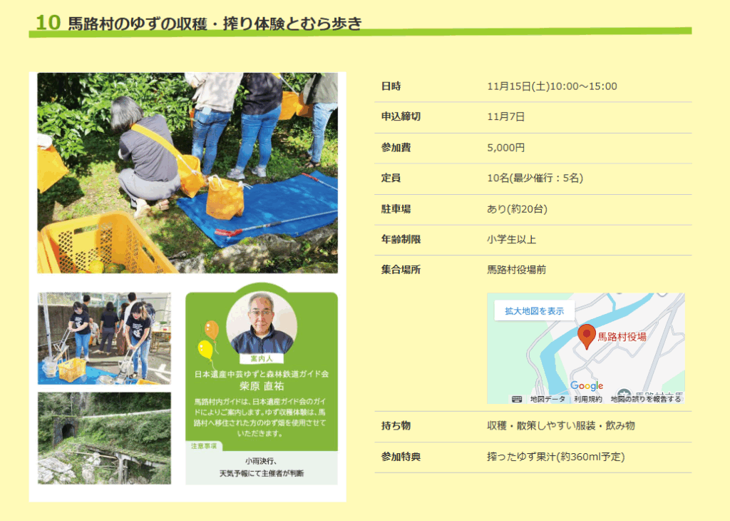 ゆずの香りがふわっと広がる山里・馬路村で、ゆずの収穫と搾り体験、そして村の中を歩いて楽しむプログラム!